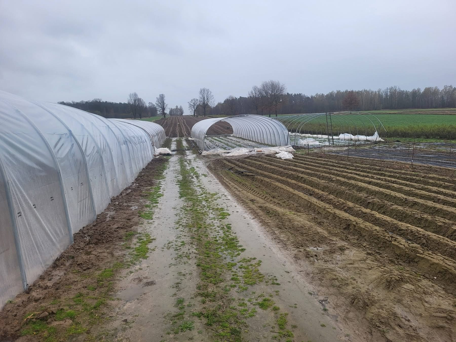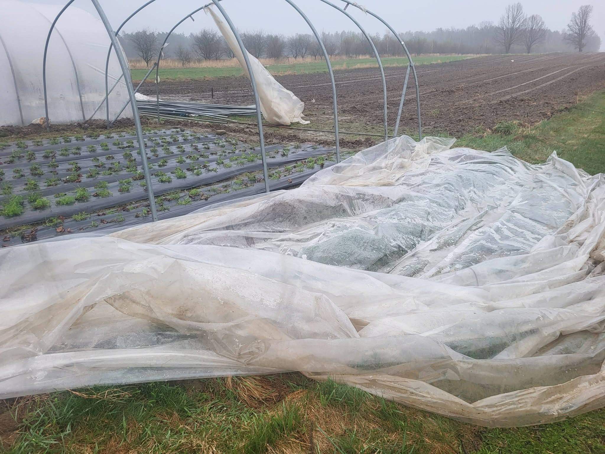 Jak relacjonuje rolnik, zaledwie 10 minut intensywnego wiatru, deszczu i gradu wystarczyło, by doprowadzić do poważnych uszkodzeń. Na opublikowanych fotografiach widać zerwane folie z tuneli, zniszczone konstrukcje oraz zalane międzyrzędzia.