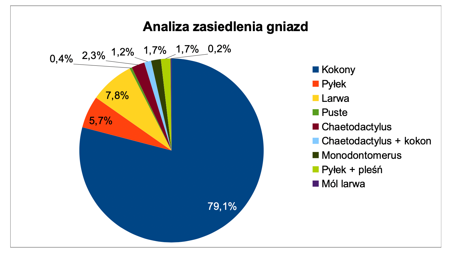 Analiza zasiedlenia gniazd polegała na otwieraniu od góry poszczególnych płytek gniazdowych oraz ocenie stopnia zasiedlenia i identyfikacji patologii występujących w gniazdach takich jak: pyłek bez jaja i larwy, zamarła larwa, puste niezasiedlone przestrzenie, spasożytowanie, pleśnienie. Uzyskane dane zapisywano liczbowo w tabeli arkusza kalkulacyjnego i przeliczono na procenty, co obrazuje poniższy wykres.