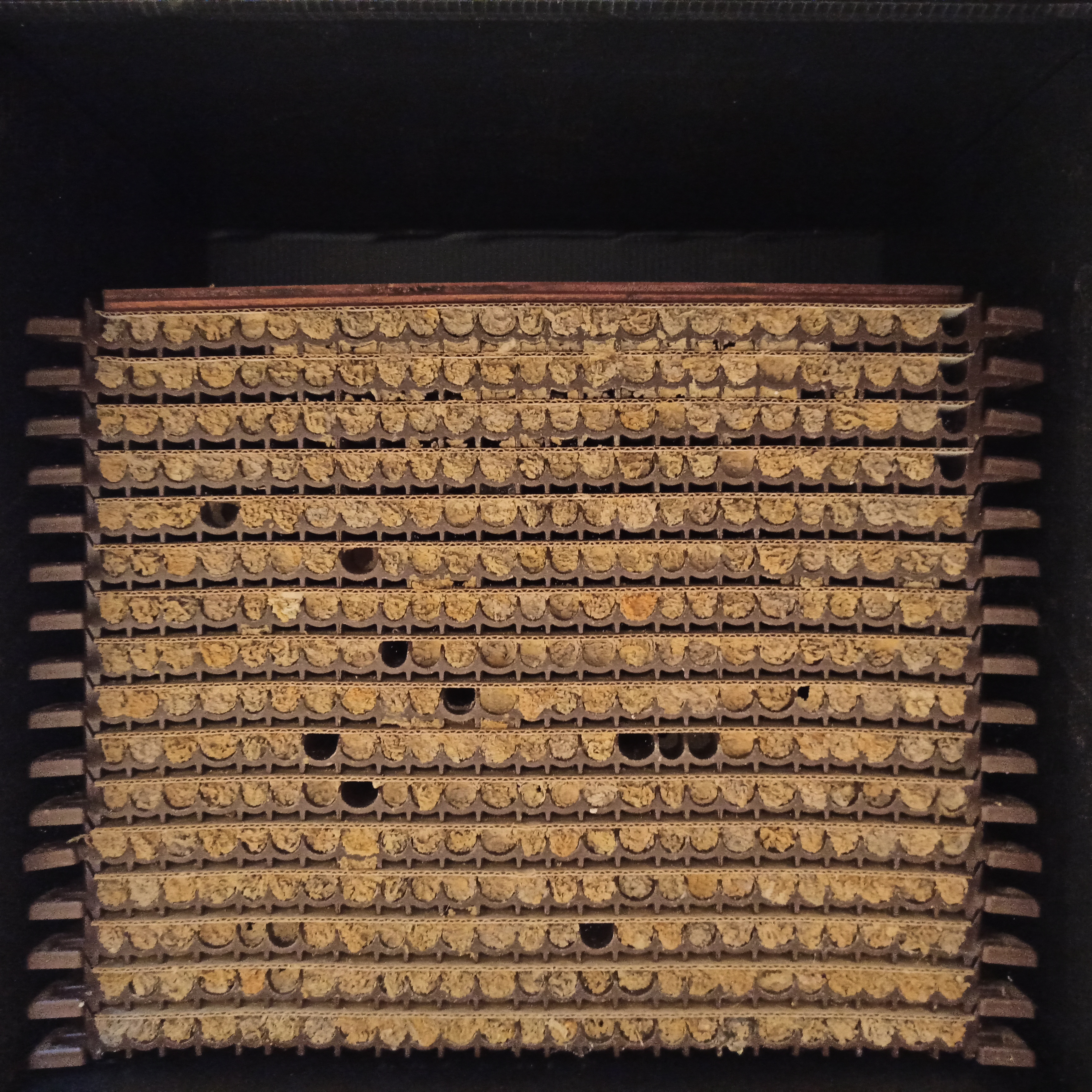 W każdym z kanałów gniazdowych założonych było średnio blisko 9 komórek. To wynik bardzo dobry, zwłaszcza, że materiały gniazdowe z tworzyw sztucznych są przez murarki zasiedlane mniej chętnie niż gniazda z trzciny.