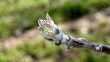 „Rozwój pąków jabłoni i gruszy w regionie Kowies i Białej Rawskiej, na odmianie Gala, Idared i grusza Konferencja widać pierwsze pękanie pąków. W sadach zabielanych glinką kaolinową można zaobserwować opóźnienie wegetacji, gdzie pąki tych samych odmian jabłoni są jeszcze zamknięte.”