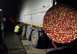 Ciężarówka przeładowana jabłkami na wagach. Zestaw wraz z ładunkiem ważył 45,5 t zamiast dopuszczalnych 40 t.