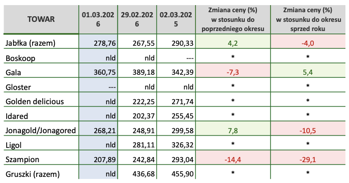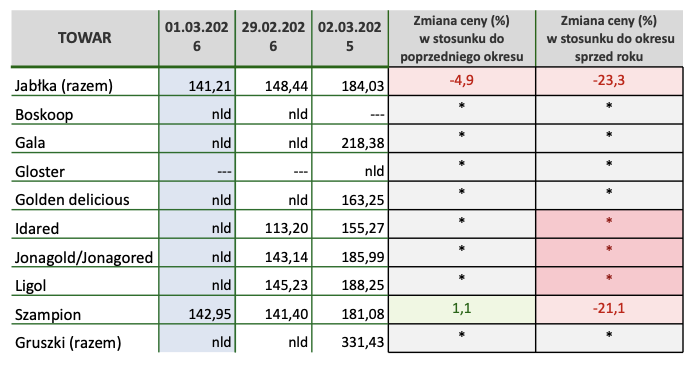 Dane wykorzystane w artykule pochodzą z raportu „Rynek owoców i warzyw nr 8/2026” przygotowanego w ramach Zintegrowanego Systemu Rolniczej Informacji Rynkowej (ZSRIR) prowadzonego przez Ministerstwo Rolnictwa i Rozwoju Wsi. Raport obejmuje notowania z okresu 23.02 – 01.03.2026 i prezentuje ceny na rynkach hurtowych, ceny zakupu i sprzedaży w organizacjach producentów oraz ceny skupu owoców do przetwórstwa.
