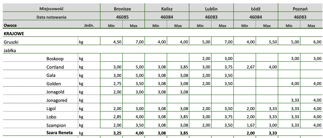 W przypadku jabłek ceny różniły się w zależności od odmiany. W tygodniu objętym raportem na rynkach hurtowych notowano następujące zakresy cen: