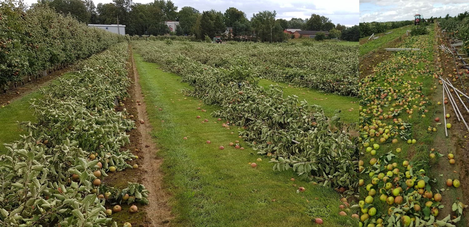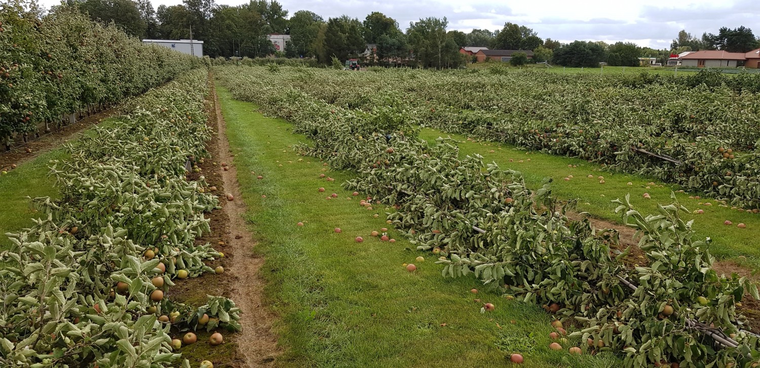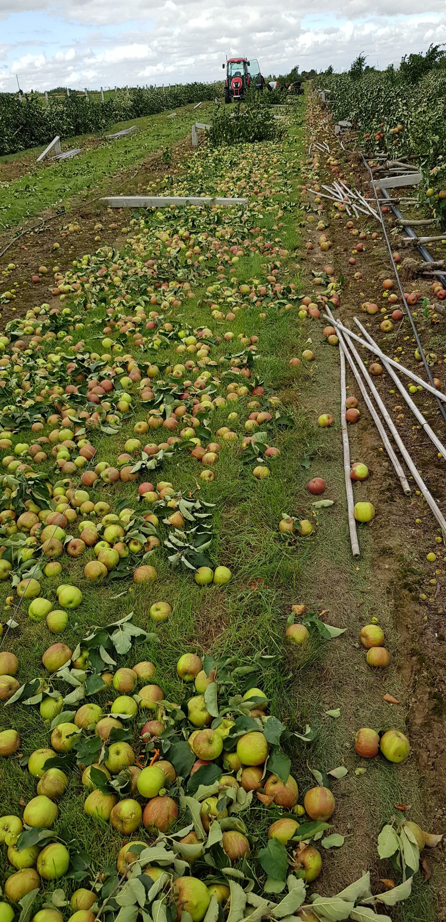 Przewrócone przez wiatr zostało 13 z 25 rzędów jabłoni. Wszystkie przewrócone drzewa nigdy już nie dadzą owoców. Owoce które spadły nie dadzą zysku. Wszystkie drzewa sadzone są w rzędach i są związane. Stanowią mur, który nie powinien się przewrócić, a jednak… siła wiatru była na tyle mocna że, wszystkie drzewa przewróciły się niczym domek z kart.