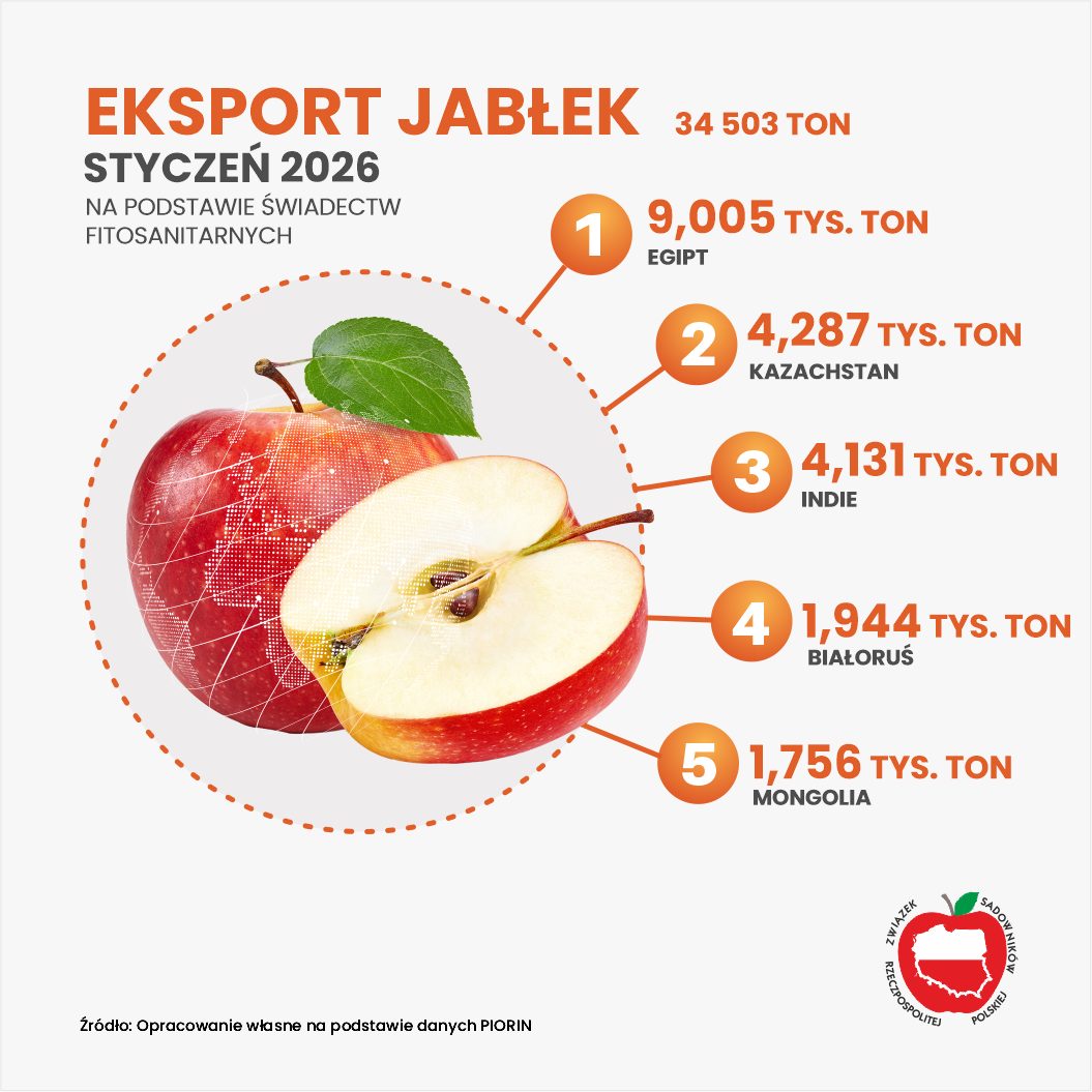 Łącznie polskie jabłka trafiły w styczniu do 34 krajów poza UE, co pokazuje szeroką geograficzną dywersyfikację eksportu.