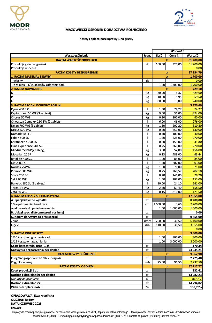 Z pomocą przychodzi najnowsze opracowanie Mazowieckiego Ośrodka Doradztwa Rolniczego w Warszawie (Oddział Radom), które szczegółowo analizuje koszty uprawy 1 ha gruszy. Dane są aktualne na czerwiec 2025 roku.