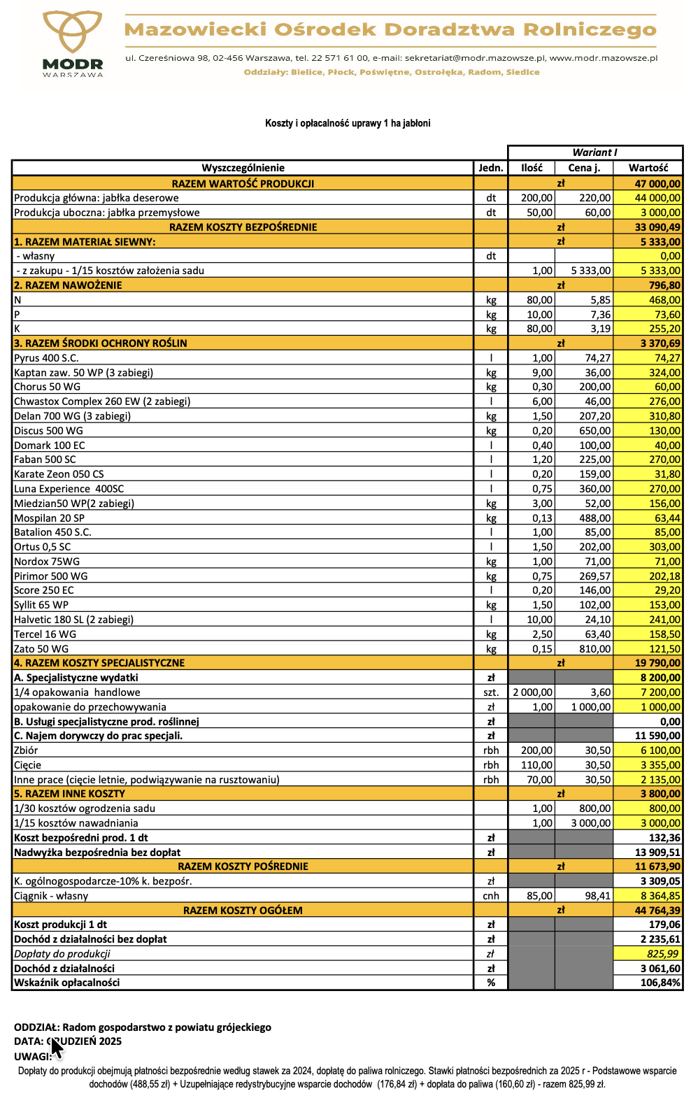 Wartość samej produkcji jabłek deserowych oszacowano na 44 000 zł, co przy plonie 20 ton daje średnią cenę sprzedaży na poziomie około 2,20 zł/kg. To właśnie do tej wielkości można odnieść rzeczywiste koszty produkcji.