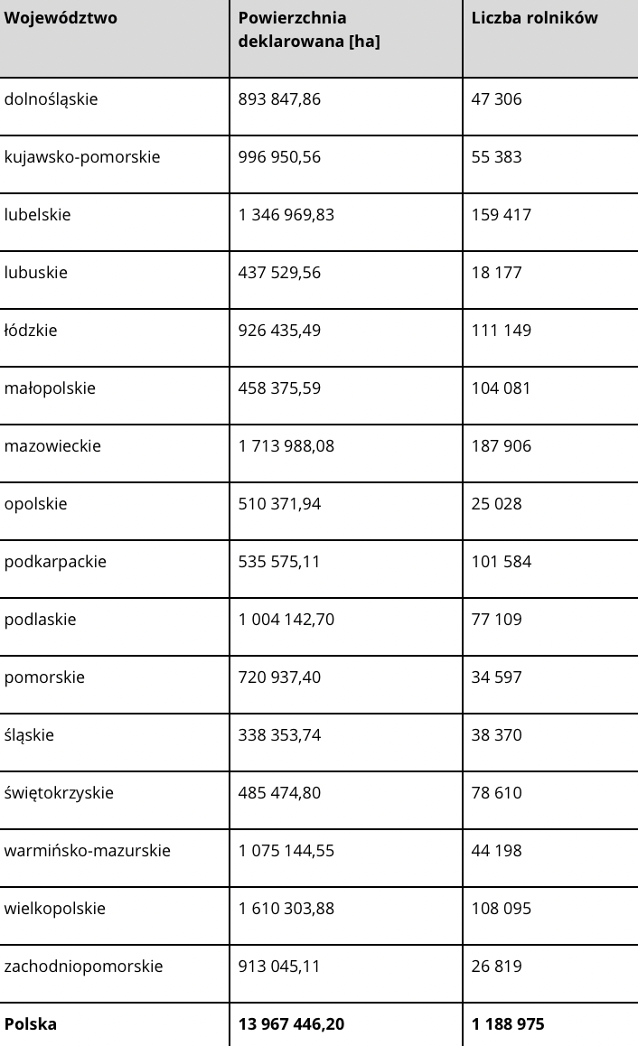 Deklarowana powierzchnia działek rolnych we wnioskach o przyznanie płatności bezpośrednich w poszczególnych województwach wynosi: