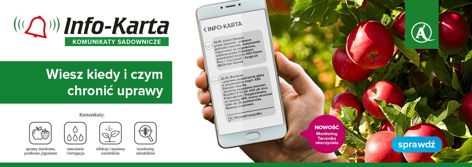 Info-karta to system dostarczający aktualne informacje o zagrożeniach chorobami i szkodnikami, zalecenia nawozowe oraz ostrzeżenia o ekstremalnych warunkach pogodowych. Informacje te, oparte na analizach danych z profesjonalnych stacji meteorologicznych i pułapek feromonowych, trafiają do sadowników za pomocą SMS-ów i e-maili.