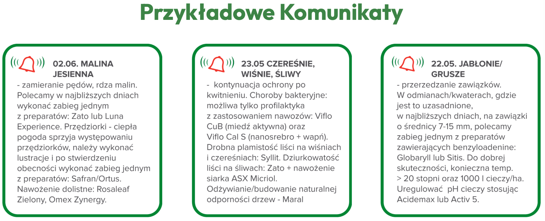 Dzięki stałemu dostępowi do aktualnych komunikatów sadownicy mogą skuteczniej reagować na zmieniające się warunki, minimalizować ryzyko i osiągać wysokie plony dobrej jakości — niezależnie od rodzaju uprawy.