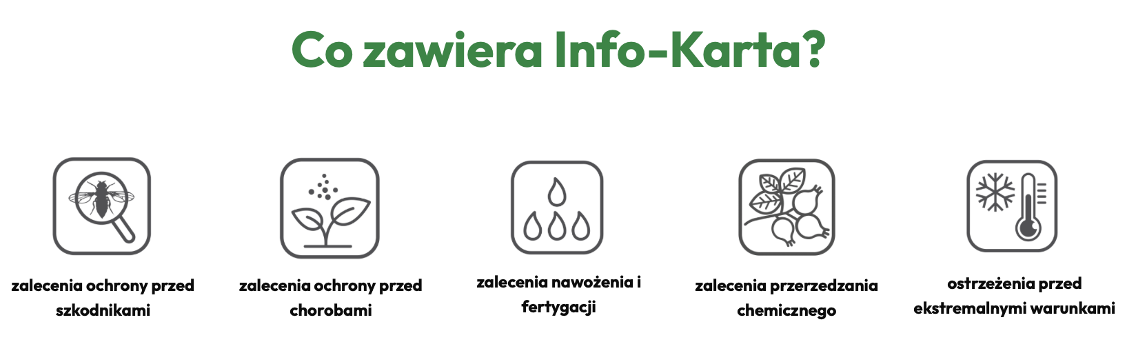 Info-Karta została stworzona z myślą o producentach różnych gatunków roślin sadowniczych, zarówno w uprawach gruntowych, jak i pod osłonami. System obejmuje m.in.: