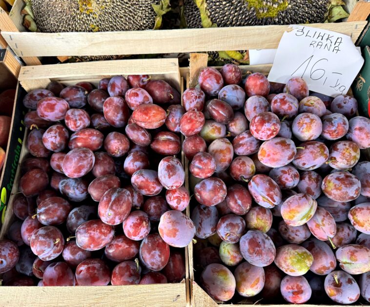 Na straganach pojawiły się już pierwsze śliwki, ale póki co są to owoce zza naszej polskiej granicy – czyli importowane. Na zdjęciu widać wczesną odmianę śliwki opisaną jako „Śliwka Rana”, sprzedawaną w cenie 16 zł za kilogram.