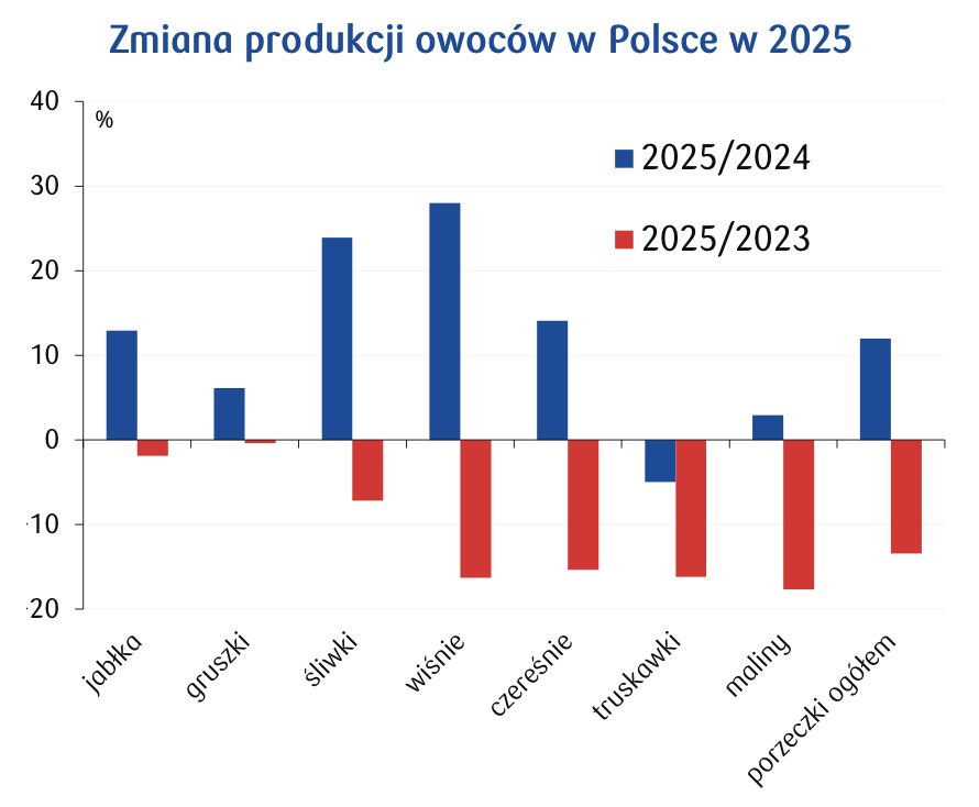 Na tym tle szczególnie pozytywnie wyróżnia się sytuacja w Polsce. GUS w grudniu po raz kolejny podniósł szacunki dotyczące produkcji owoców w 2025 roku. Według ostatecznych danych zbiory owoców z drzew wzrosły niemal o 13,5% rok do roku, osiągając poziom 4,2 mln ton. To wyraźna korekta w górę w porównaniu z wrześniową prognozą, która zakładała wzrost o około 10% r/r.