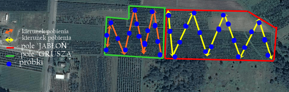 Wydzielam obszar uprawy jabłoni i z niego pobieram 20 próbek na jedną próbę (metoda zygzaka). Opisuję „ POLE I JABŁOŃ 3 HA”.