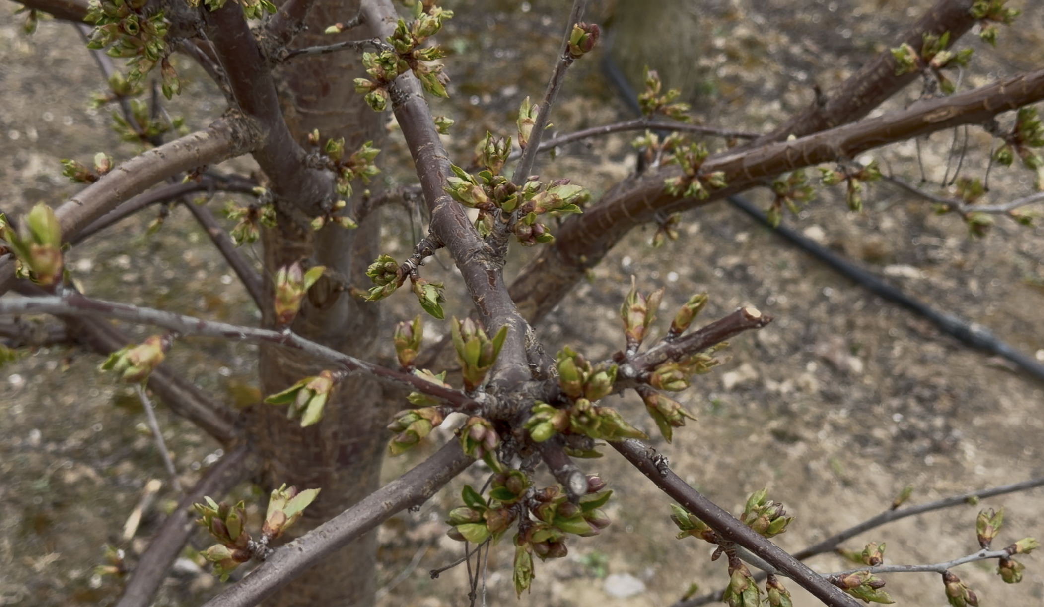 „Stadium rozwinięcia trochę się opóźniło, bo przymrozki występują już od trzech, czterech dni na poziomie 3,5 do 4 stopni na minusie. Fazy jakie mamy to zielony pąk w jabłoni, porzeczka już jest w takim stadium, że pąki widać do kwitnienia.” – informuje sadownik Mieczysław.