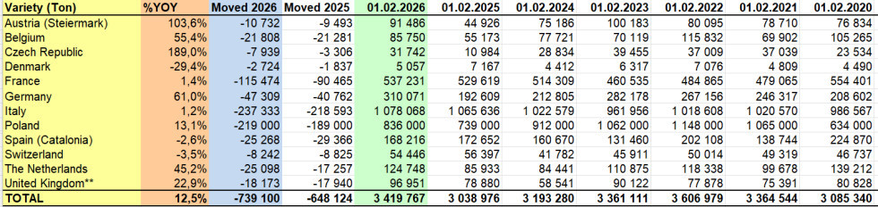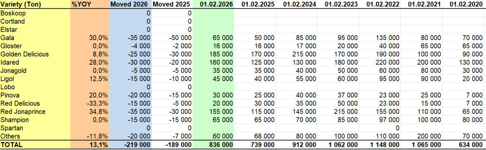 Na początku lutego 2026 roku w chłodniach państw Unii Europejskiej znajdowało się 3 419 767 ton jabłek, czyli o ponad 380 tys. ton więcej niż rok wcześniej.