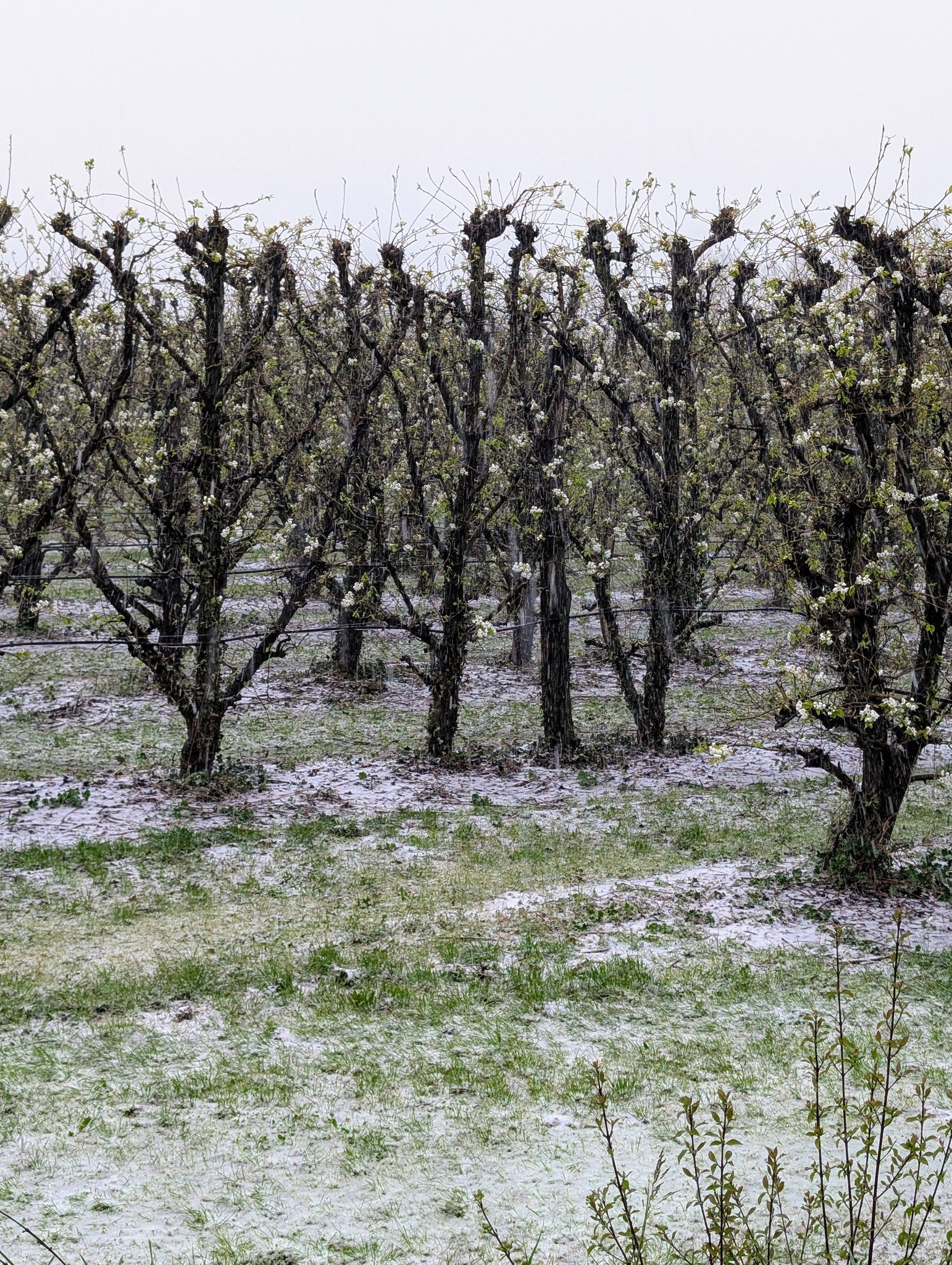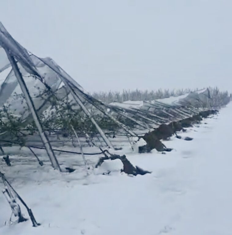 Ciężar mokrego śniegu zniszczył konstrukcje nad sadami jabłoni, moreli i brzoskwiń. W wielu gospodarstwach uszkodzone zostały również drzewa – połamane gałęzie i opadłe kwiaty oznaczają bezpośrednią utratę przyszłych owoców.