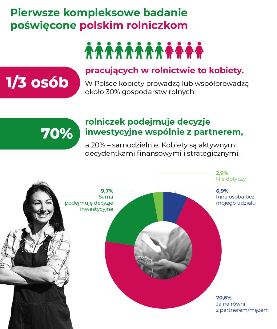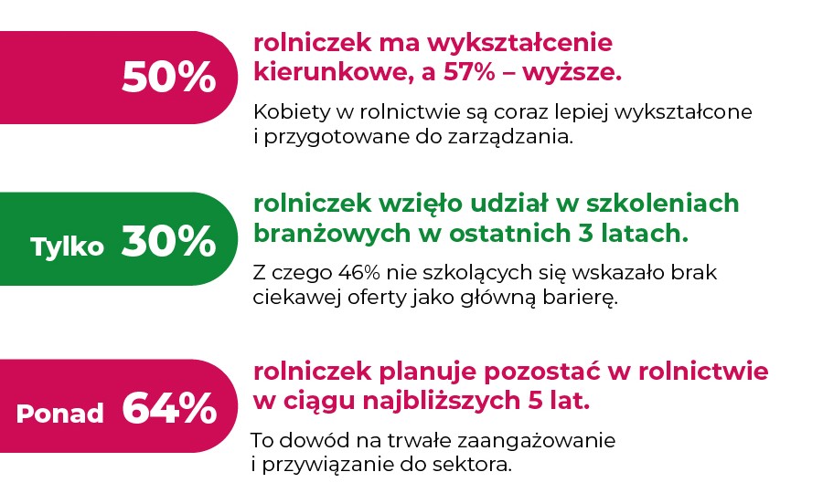 Ponad 70% rolniczek deklaruje współudział w podejmowaniu decyzji inwestycyjnych, a 20% podejmuje je całkowicie samodzielnie. Kobiety w rolnictwie nie są już tylko „pomocą w gospodarstwie” – są współodpowiedzialne za jego rozwój i kierunki działań, a niejednokrotnie same kierują gospodarstwem czy produkcją żywności. Ich rola w administracji i sprzedaży jest niewidoczna i niedoceniana. Połowa z rolniczek ma wykształcenie kierunkowe, a 57% – wyższe, co czyni z nich kompetentne partnerki w planowaniu i wdrażaniu nowych rozwiązań w gospodarstwach.