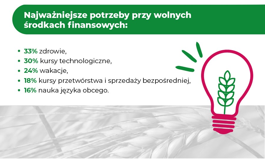 Raport pokazuje także ważne aspekty życia codziennego, w tym dobrostanu rolniczek. Gdy zapytano je, na co przeznaczyłyby wolne środki finansowe, aż 33% wskazało zdrowie – zarówno fizyczne, jak i psychiczne. 24% chciałoby po prostu wyjechać na wakacje, a niemal 30% zainwestowałoby w szkolenia z zakresu nowych technologii w rolnictwie. Pojawiły się też potrzeby związane z nauką języków obcych, kompetencjami liderskimi czy kursami sprzedaży bezpośredniej.