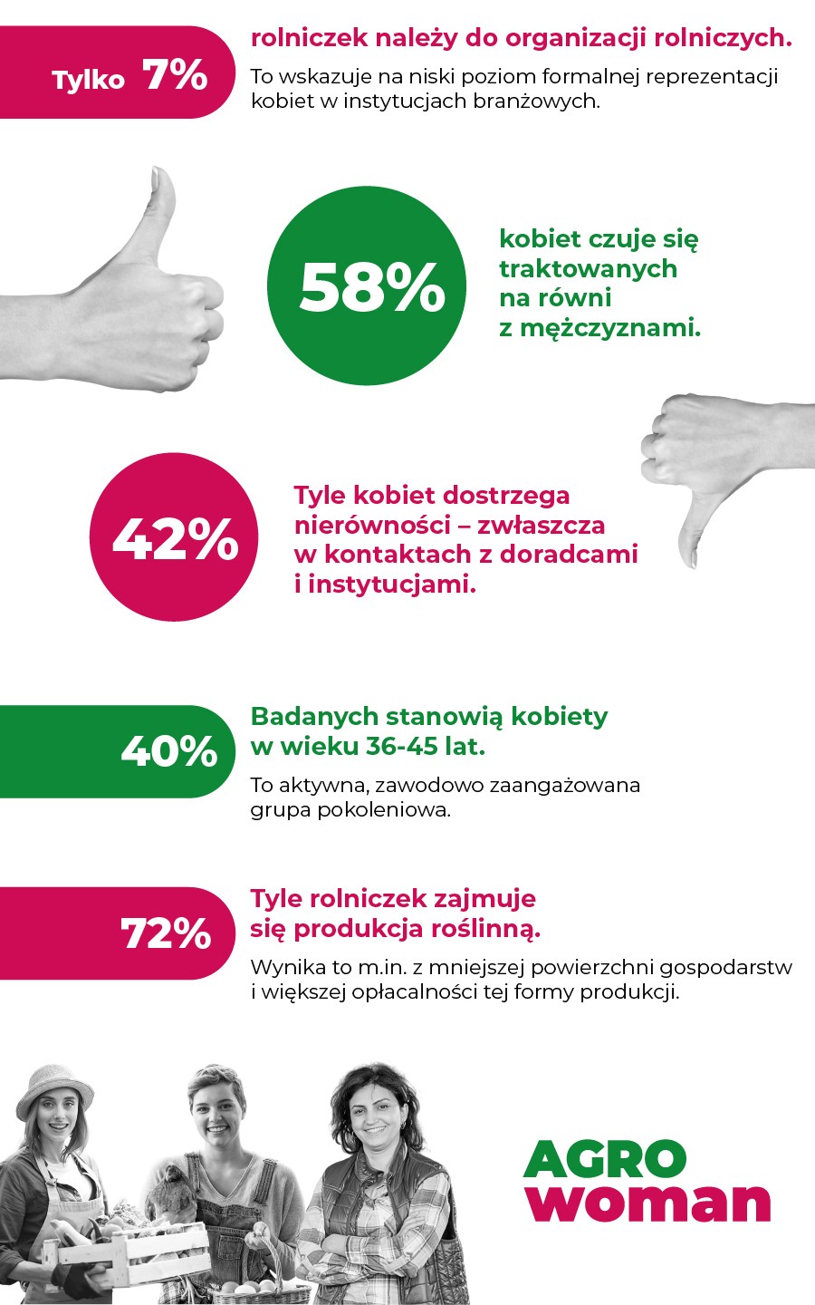 Z przeprowadzonego przez Fundację Agro Woman i IRWiN badania wynika, że kobiety stanowią aż jedną trzecią osób pracujących w polskim rolnictwie. W ostatnich latach ich udział wśród osób prowadzących gospodarstwa rolnicze systematycznie rośnie. Wciąż jednak są słabiej reprezentowane w organizacjach branżowych i instytucjach decyzyjnych. Tylko 7% badanych należy do organizacji rolniczych, mimo że w większości to one podejmują kluczowe decyzje inwestycyjne – samodzielnie lub wspólnie z partnerem.