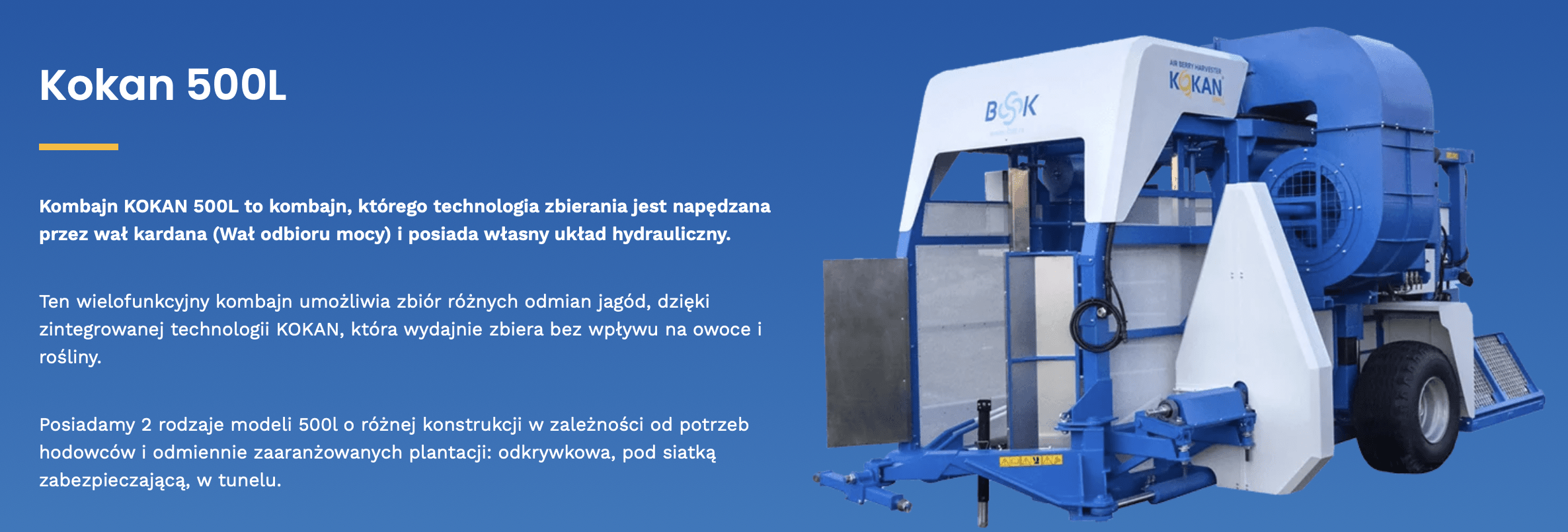 Kombajn do borówki Kokan stanowi zaawansowane technologicznie rozwiązanie w dziedzinie mechanicznego zbioru owoców jagodowych, ze szczególnym uwzględnieniem borówki amerykańskiej. W kontekście dynamicznie rosnącego zapotrzebowania na efektywne metody zbioru, wynikającego z ograniczonej dostępności i rosnących kosztów pracy ręcznej, kombajny Kokan jawią się jako innowacyjna odpowiedź na potrzeby plantatorów.