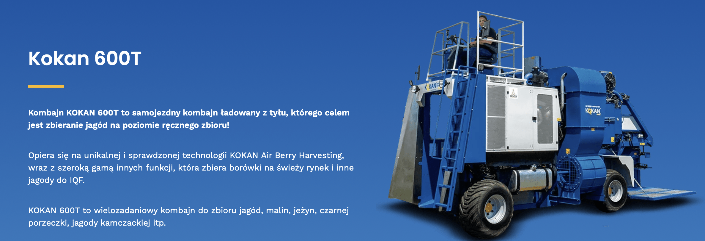 KOKAN 600T to najnowszy, samojezdny kombajn w ofercie firmy . Został zaprojektowany z myślą o osiągnięciu jakości zbioru porównywalnej do zbioru ręcznego. Jest to maszyna wielozadaniowa, przeznaczona do zbioru różnych owoców jagodowych, w tym borówki, malin, jeżyn, czarnej porzeczki i jagody kamczackiej . Kombajn wyposażony jest w szereg zaawansowanych funkcji, takich jak kolorowy wyświetlacz o wysokiej rozdzielczości, tempomat, system kamer, automatyczne poziomowanie i regulacja wysokości, system śledzenia środka rzędów, światła LED do pracy nocnej, wydłużony tylny pokład (przystosowany do palet o wymiarach 40 x 48 cali), zintegrowany zaczep przyczepy oraz opony o dużej powierzchni styku, ułatwiające poruszanie się w trudnych warunkach terenowych . Trójkołowa konstrukcja zapewnia optymalną zwrotność na plantacji, co przekłada się na mały promień skrętu .