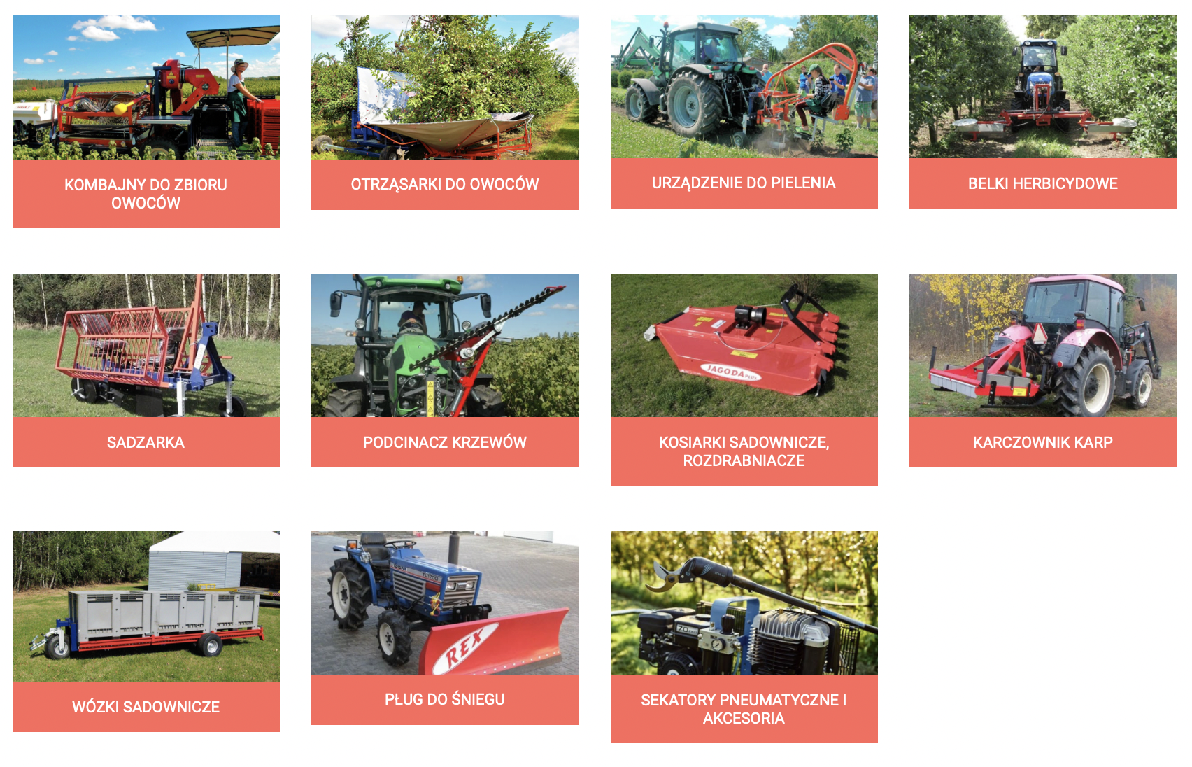 O firmie: JAGODA JPS jest wiodącym w Polsce oraz rozpoznawalnym na świecie producentem maszyn sadowniczych, w szczególności produkcji kombajnów do zbioru owoców jagodowych, takich jak borówka, porzeczka, agrest, aronia, jagoda kamczacka, świdośliwa, malina, wiśnia, śliwa, itp. Firma rozwija również inny asortyment, między innymi osprzęt do mikrociągników, czy maszyny do pielęgnacji sadów i plantacji.