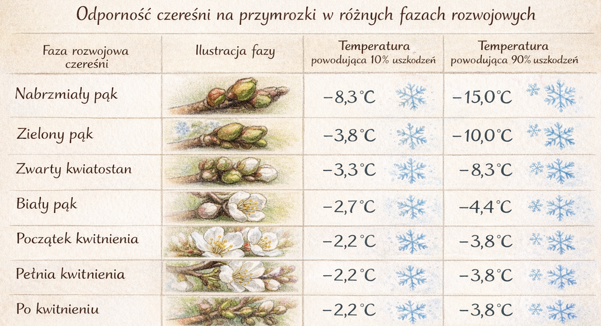 Wiosenne spadki temperatur w okresie kwitnienia to jeden z najpoważniejszych czynników ryzyka w uprawie czereśni. To właśnie w tej fazie drzewa są najbardziej wrażliwe, a nawet krótkotrwały przymrozek może znacząco ograniczyć plon. W praktyce sadowniczej kluczowe jest rozumienie progów uszkodzeń oraz ich zależności od fazy fenologicznej.