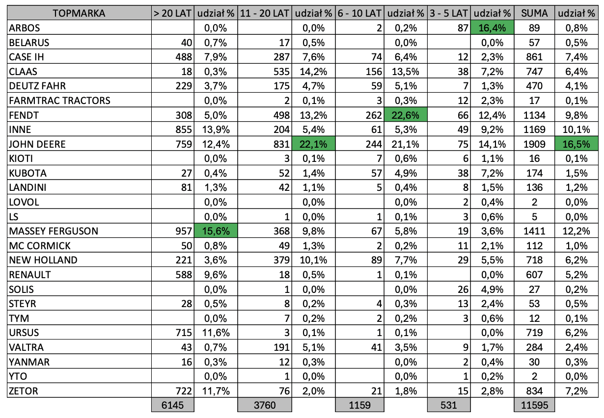 - Od 11 do 20 lat: Liderem jest John Deere z udziałem 13,9%.
