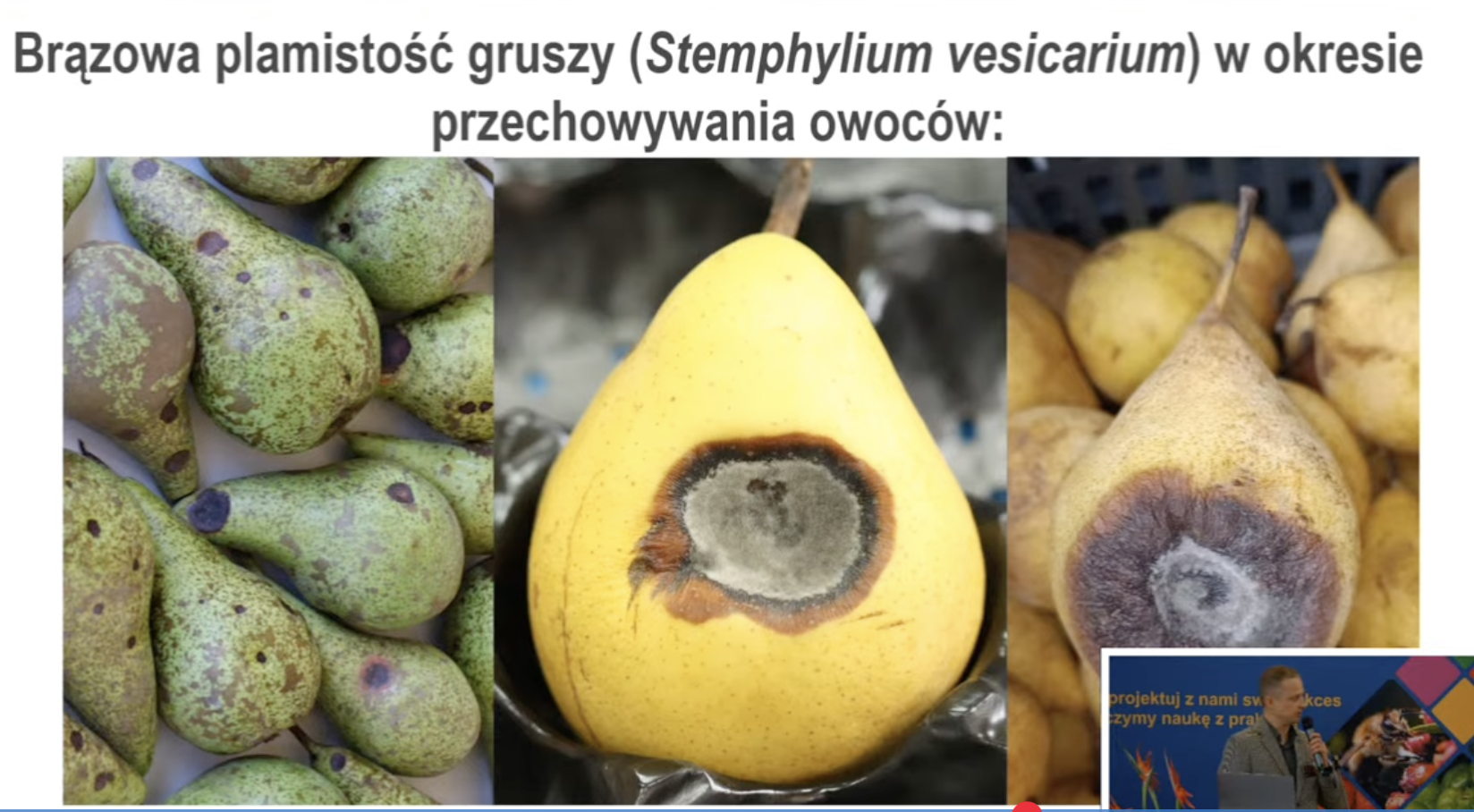 na gruszkach plamy są zapadnięte, a owoce tracą jędrność.