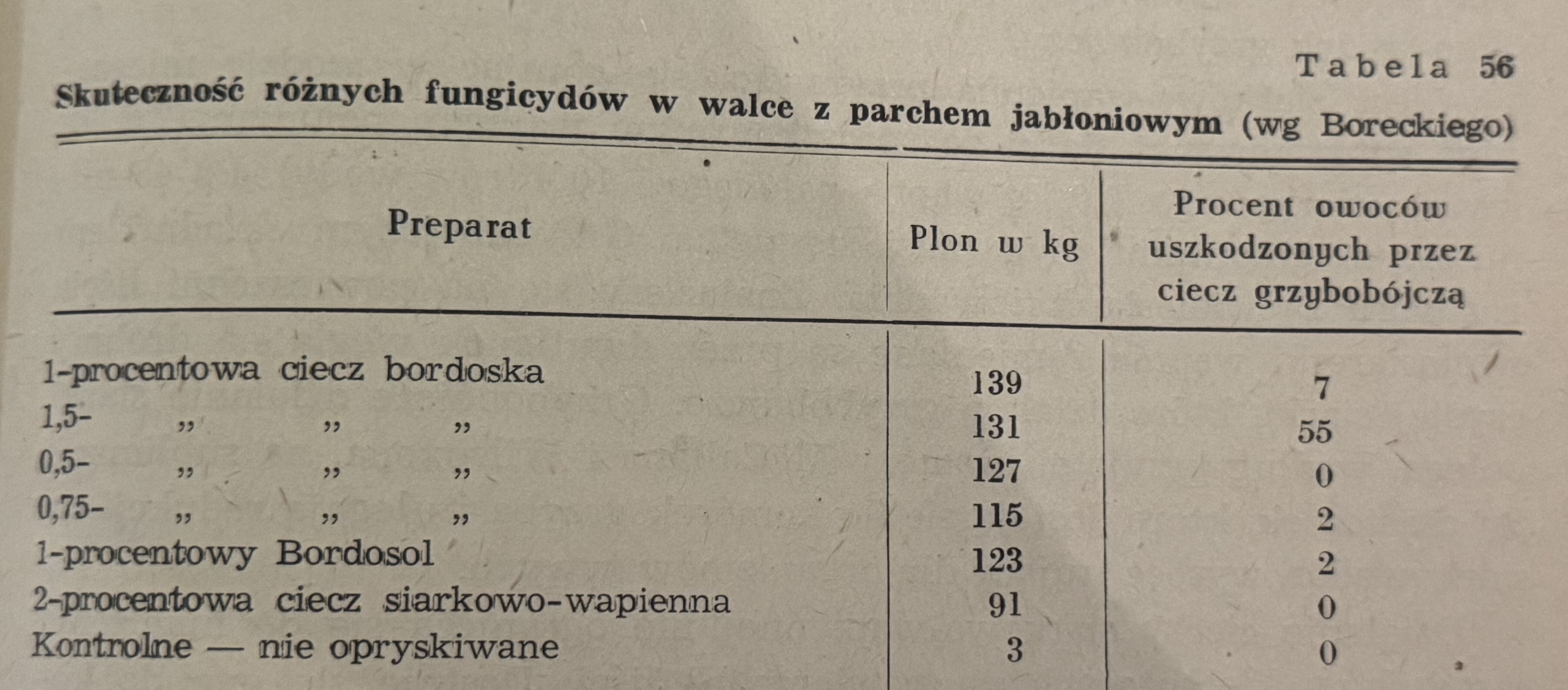 W tabeli nr 56 prof. Pieniążek przytacza wyniki badań z 1950 roku, przeprowadzonych przez Boreckiego, które potwierdzają wysoką skuteczność cieczy bordoskiej w walce z parchem jabłoniowym.