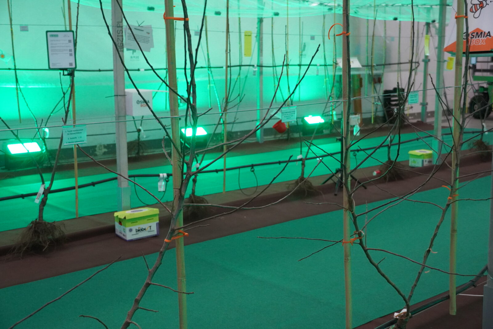 Nad jabłoniami zaprezentowano nowoczesny system siatek przeciwgradowych, przeznaczony szczególnie do wąskich kwater, gdzie trudno zastosować klasyczne konstrukcje. Rozwiązanie pozwala na szybkie rozwijanie i zwijanie siatki, dzięki czemu sadownik może elastycznie reagować na zagrożenie gradem lub regulować dostęp światła do koron drzew. System nadaje się zarówno do nowych nasadzeń, jak i do już istniejących sadów, o ile konstrukcja jest odpowiednio zakotwiona.