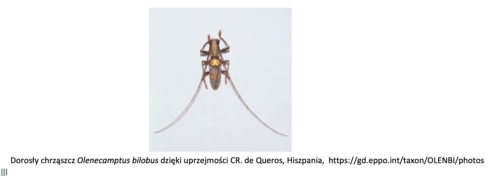 Olenecamptus bilobus jest chrząszczem z rodziny kózkowatych (Cerambycidae). Został on stwierdzony w Azji (Chiny, Indie, Indonezja, Japonia, Laos, Malezja, Mjanma, Nepal, Pakistan, Sri Lanka, Tajlandia, Tajwan i Wietnam), Afryce (Komory, Madagaskar, Seszele) i Oceanii (Australia, Mikronezja, Papua-Nowa Gwinea, Vanuatu). W 2023 r. miały miejsce pierwsze przypadki odłowienia szkodnika na pułapki w Europie. Najpierw odłowiono 1 osobnika na greckiej wyspie Lemnos, gdzie przybył on prawdopodobnie transportem morskim. Kolejne dwa dorosłe chrząszcze zostały odłowione na pułapki znajdujące się w odległości 7,5 i 13 km od lotniska w Alicante (Hiszpania). Pułapki wywieszono na obszarze, gdzie znajdują się szkółki, stąd trudno ustalić, czy owady przedostały się transportem lotniczym, czy z porażonymi roślinami do sadzenia. W krajach Unii Europejskiej Olenecamptus bilobus nie podlega obowiązkowi zwalczania.