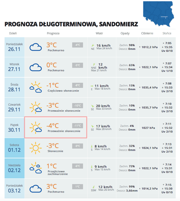 W tym roku według synoptyków początek grudnia będzie mroźny. Nasze termometry wskażą nawet -10°C w Grójcu, a -11°C w Sandomierzu (nocami).