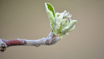 Zarodnikowanie grzyba powodującego mączniaka występuje w fazie mysich uszek oraz zielonego pąka. Zarodniki pojawiają się na tkankach zielonych. W sadach w fazie pękania pąków presja ze strony zarodników nie występuje w dużej skali.