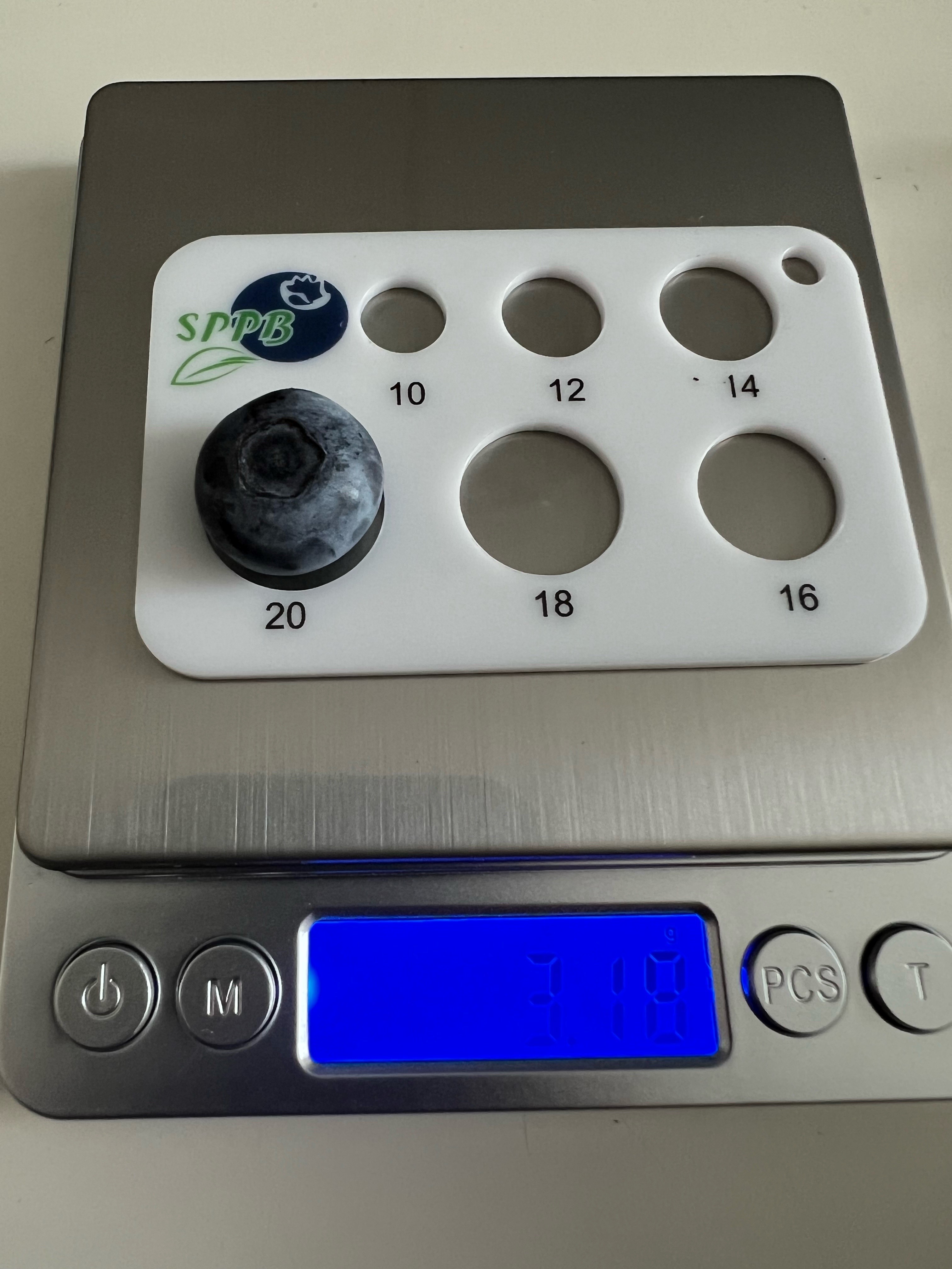 Skupmy się przez chwilę na wielkości owoców i przełożeniu na plon. Ile ważą owoce borówki? Owoce średnicy 12-13 mm ważą około 0,7 – 0,9 grama (przypominam, że w minionym sezonie wiele owoców nie spełniało kryterium 12+, stąd wymogi sieci i grup zostały obniżone do 10 mm – tu waga to ok. 0,6 g/szt ), owoce o średnicy 14-15 mm przekraczają 1,5 g, 16 mm – 1,7-1,8 g, 17 mm przekracza 2 g, a dalej 18 mm – 2,5 g, 20 mm – 3 g, 22 mm – 4 g, 23 mm – blisko 5 g. Zwróćmy uwagę, że przy zmianie średnicy z 12 na 14 mm następuje podwojenie masy pojedynczego owocu. Zwiększenie średnicy owoców z 12-13 mm na 17-18 zwiększa masę 3-krotnie.