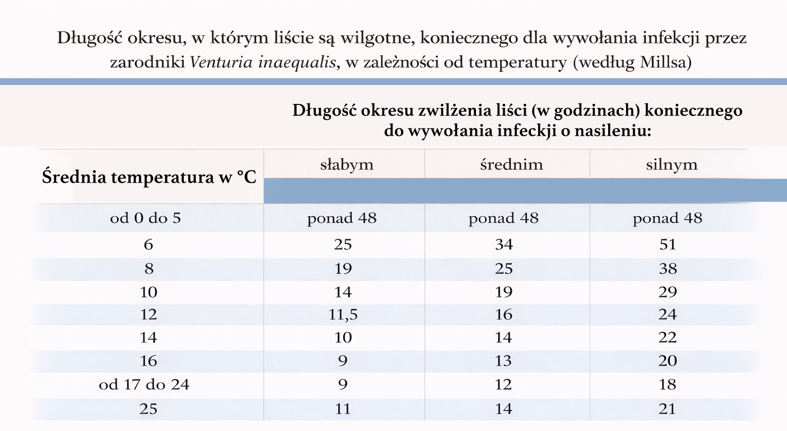 W połowie XX wieku opracowano zestawienie określające minimalny czas zwilżenia liści niezbędny do wystąpienia infekcji przy różnych temperaturach. Był to przełom w podejściu do ochrony jabłoni, ponieważ umożliwił odejście od rutynowych oprysków wykonywanych „co tydzień” na rzecz zabiegów uzależnionych od rzeczywistego ryzyka choroby.