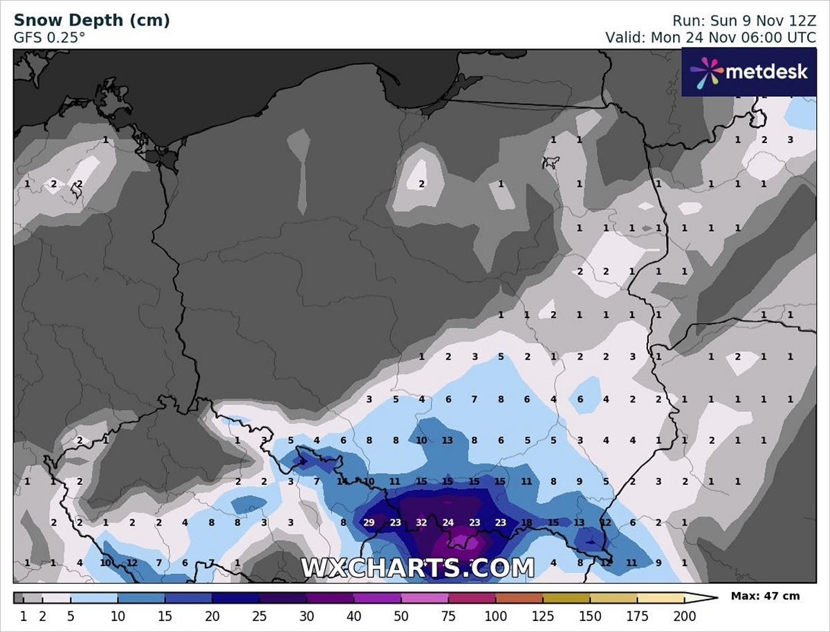Pokrywa śnieżna (w cm) prognozowana na 24 listopada. Fot. wxcharts.comTo będzie zaledwie lekki powiew zimy, który poprzedzi znacznie bardziej dotkliwe jej uderzenie, które czeka nas w ostatniej dekadzie miesiąca. Prognozy od dłuższego czasu wskazują, że między 20 a 25 listopada w wielu regionach kraju mróz będzie całodobowy, a śniegu spadnie dużo więcej.