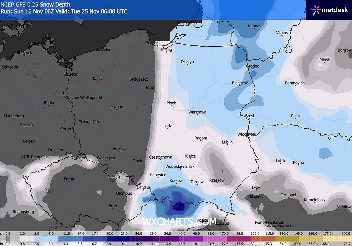 Tyle śniegu może leżeć 25 listopada. Fot. wxcharts.comOd czwartku (20.11) zaczną wracać przelotne opady deszczu, deszczu ze śniegiem i śniegu, szczególnie w regionach południowych i północno-zachodnich. Jeśli krajobrazy się zabielą, to na krótko i tylko miejscami.