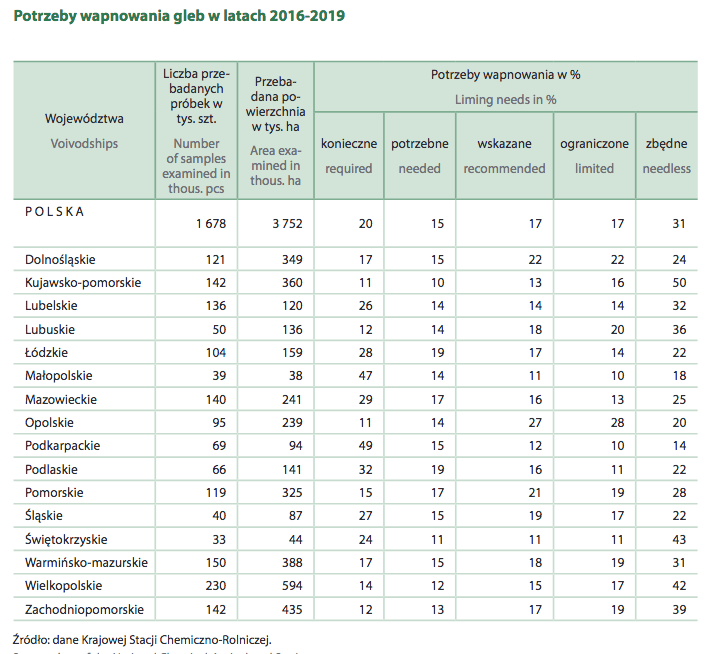 Najbardziej zakwaszone gleby odnotowano w województwie podkarpackim oraz w województwie małopolskim 61% badanych gleb. Najmniejszą potrzebę wapnowania gleb stwierdzono w województwach kujawsko-pomorskim, w którym ponad 50% gleb nie wymaga wapnowania oraz w województwach świętokrzyskim i wielkopolskim, gdzie ponad 40% gleb wykazuje potrzeby odkwaszania poprzez nawożenie wapnem.