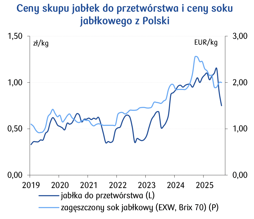 Według analiz PKO BP, presja podaży utrzyma się do końca sezonu 2025/26, a spadkowy trend cen jabłek przemysłowych może być kontynuowany. Niskie zapasy z poprzedniego roku przestały już być czynnikiem wspierającym rynek, a przy rosnącej podaży i słabszym eksporcie trudno oczekiwać odbicia.
