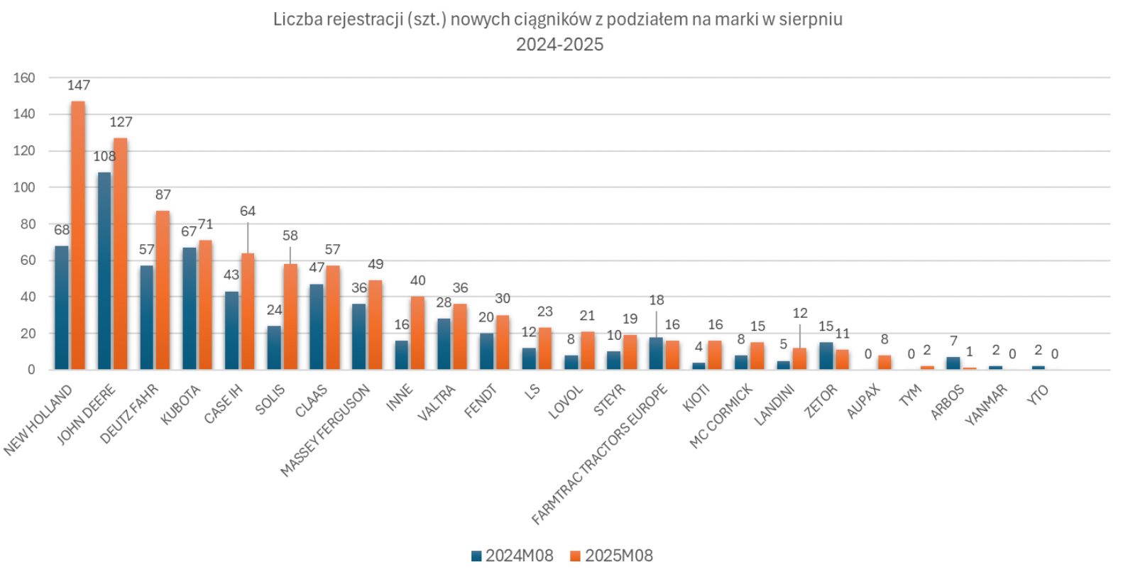 Ranking marek W sierpniu 2025 roku na czele rankingu najpopularniejszych marek znalazł się New Holland, z 147 zarejestrowanymi sztukami. Marka ta odnotowała 14,84% wzrostu w porównaniu do lipca 2025 roku. New Holland jest również liderem w skumulowanym rankingu od stycznia do sierpnia 2025 roku, z 1076 zarejestrowanymi ciągnikami i 15,2% udziałem w rynku, co stanowi poprawę o 3,3 punktu procentowego w porównaniu do 2024 roku.