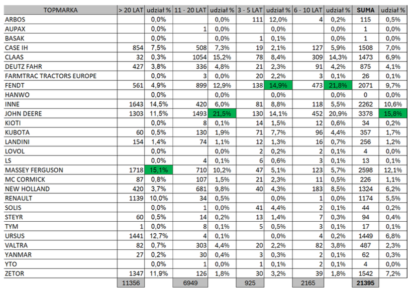 John Deere jest szczególnie mocny w segmencie 11–20 lat, gdzie osiąga aż 21,5% udziału w rynku. To dowód, że modele tej marki zachowują wysoką wartość użytkową nawet po kilkunastu latach pracy.