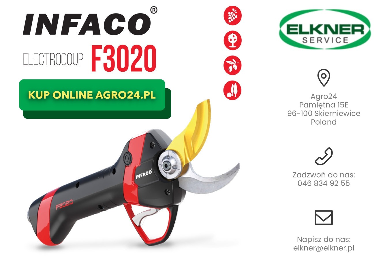 Od zeszłego sezonu polscy sadownicy i producenci rolni mają dostęp do najnowszej wersji sekatora – Infaco Electrocoup 3020. Model F3020 to rezultat ponad sześcioletnich prac badawczo-rozwojowych. Bazując na doskonałej technologii poprzednika, modelu F3015, inżynierowie INFACO wprowadzili szereg ulepszeń, które czynią F3020 liderem na rynku sekatorów elektrycznych.