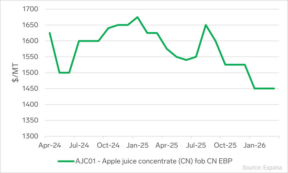 Na koniec marca 2026 roku ceny koncentratu jabłkowego (low acid, FOB Chiny) wynosiły: