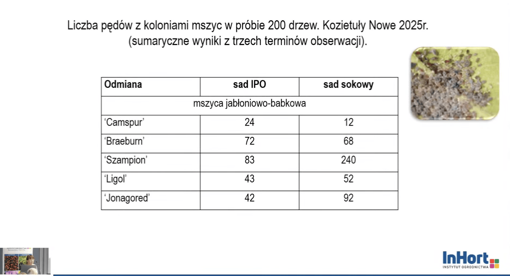 Dr Sekrecka przedstawiła szczegółowe dane dotyczące intensywności ochrony zoocydowej w sadach IPO oraz sadach sokowych. Różnice między poszczególnymi rodzajami sadów były wyraźne – sady sokowe wymagały z reguły mniejszej liczby zabiegów, jednak skutkowało to większym nasileniem szkodników.