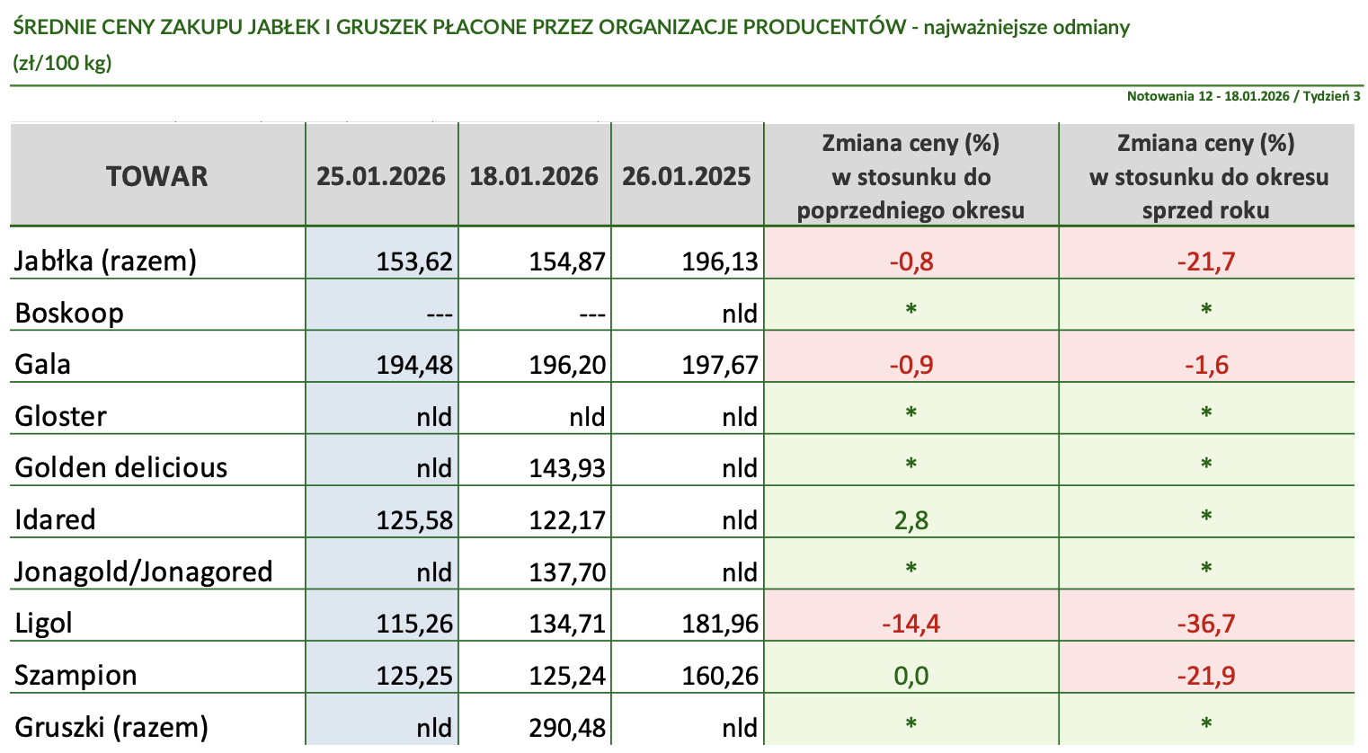 Najnowsze notowania organizacji producentów z trzeciego tygodnia stycznia 2026 roku pokazują, że ceny jabłek w zakupie utrzymują się na niskim poziomie. Po przeliczeniu stawek z tabeli (zł/100 kg) na realne ceny za 1 kilogram, sytuacja producentów wygląda jeszcze mniej optymistycznie.