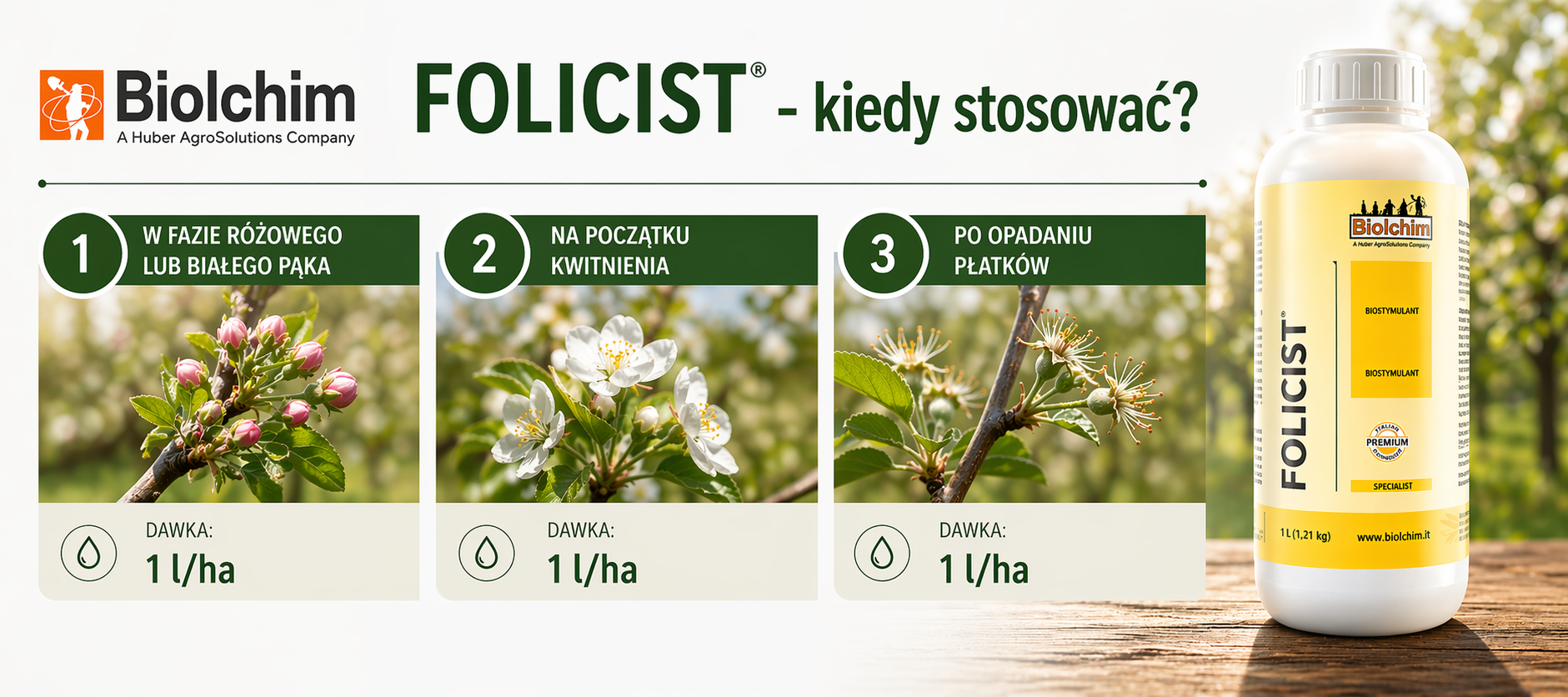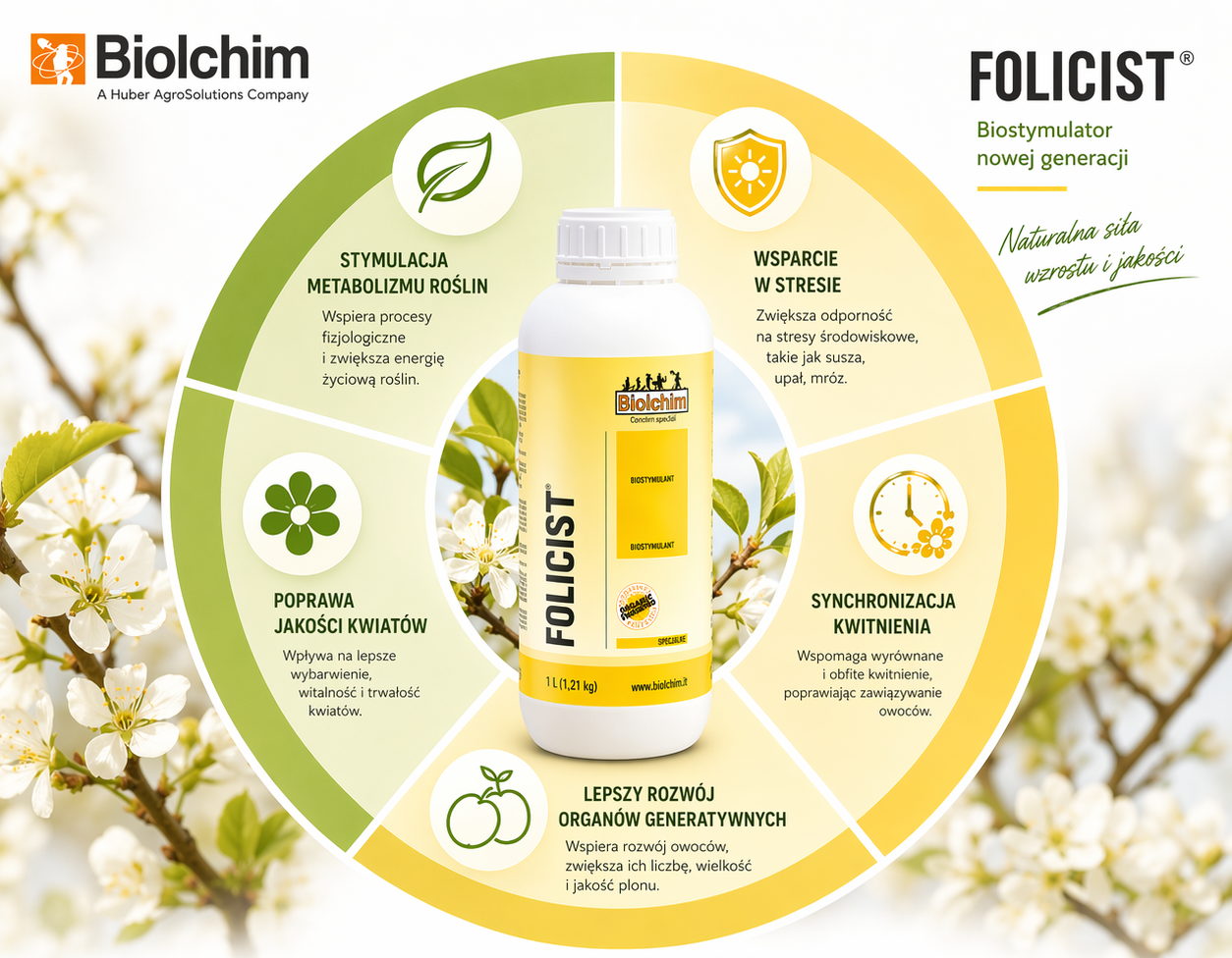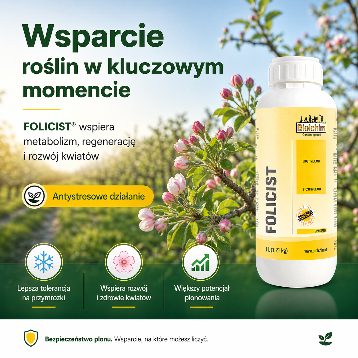 Jednym z rozwiązań stosowanych w praktyce sadowniczej jest FOLICIST® – biostymulator opracowany z myślą o okresach najwyższego zapotrzebowania energetycznego roślin, takich jak faza przedkwitnieniowa i kwitnienie.