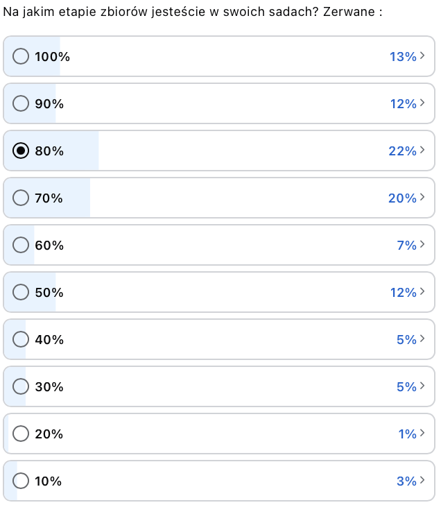 Aby sprawdzić, na jakim etapie znajdują się sadownicy, przeprowadziliśmy ankietę (z udziałem ok. 4 tysięcy sadowników): „Jaki procent jabłek został już zebrany w Twoim sadzie?”. W badaniu brali udział producenci z całej Polski, a odpowiedzi pokazały duże zróżnicowanie zaawansowania prac. Oto szczegółowe wyniki ankiety dotyczącej stopnia zebrania jabłek: